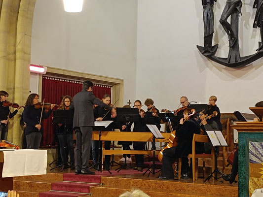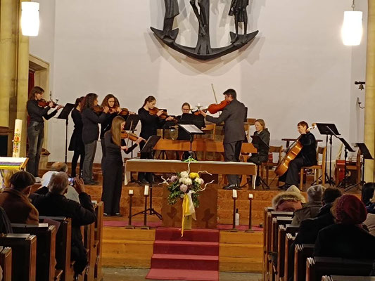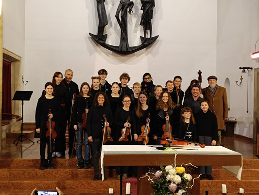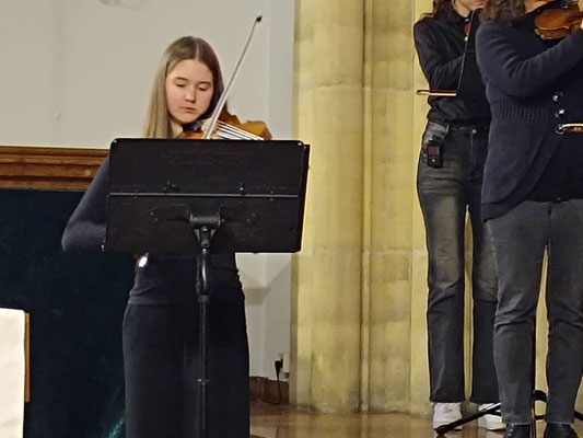 ein Kirchenkonzert in der Pfarrkirche Deutsch-Wagram. FĂŒr das wunderbare Programm bot die Kirche das passende akustische und optische Ambiente, um Barockmusik von Telemann, Vivaldi und Corelli erklingen zu lassen. Eine Triosonate von G. Ph. Telemann eröffnete das Konzert (Karin Heinisch- Blockflöte, Eva Steinhauser - Flöte, Paul Mittermayer - Violine, Manveer Mangat Cello, Marita Rohregger- Cembalo). Bei dem zweiten Satz des Konzertes fĂŒr zwei Mandolinen von Antonio Vivaldi bezauberten die beiden Gitarristinnen Natalie und Melanie Weiner als Solistinnen. Das Concerto Grosso op. 6 Nr. 8 wird wegen des abschlieĂenden "Pastorale" auch "Weihnachtskonzert" genannt. als SolistInnen brillierten hier Iris Guthauer und Joela Huber an der Violine und Cellistin Karin Heinisch. Das abschlieĂende "Improptu Nr. 5 fĂŒr Streicher" von Jean Sibelius hinterlieĂ das Publikum in einer zauberhaften winterliches Stimmung