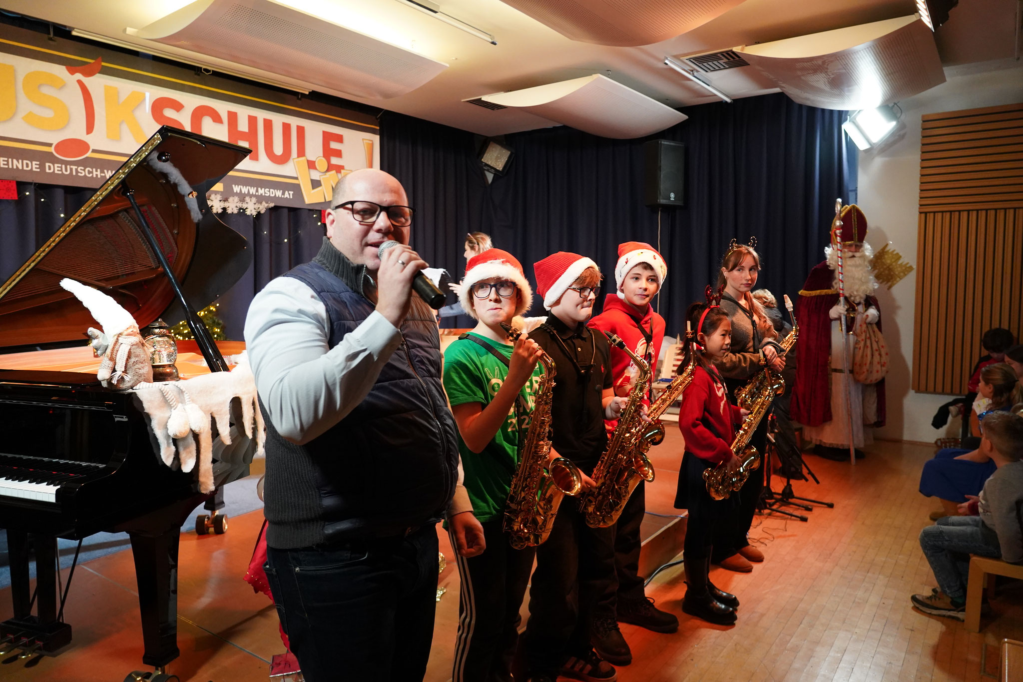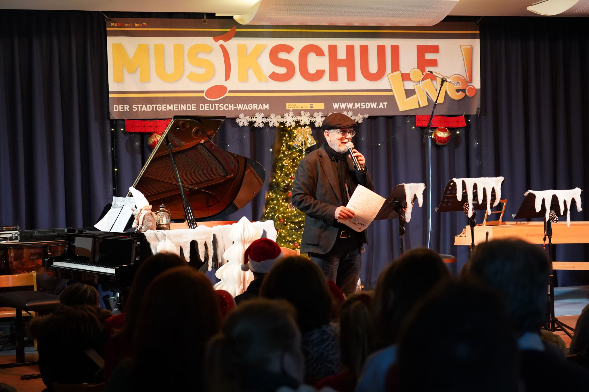 Am 22. November 2024 fand im Konzertsaal der Musikschule das 14. Sekt- und Brötchenkonzert statt. Die erwachsenen Schüler präsentierten ihr beeindruckendes Können auf ihren Instrumenten und boten ein vielseitiges Programm von Klassik bis Jazz. Herr Direktor Karl Rosenmayer führte charmant durch den Abend und unterhielt das Publikum mit seinen „Millionen-Show Fragen“, die für viele heitere Momente sorgten.